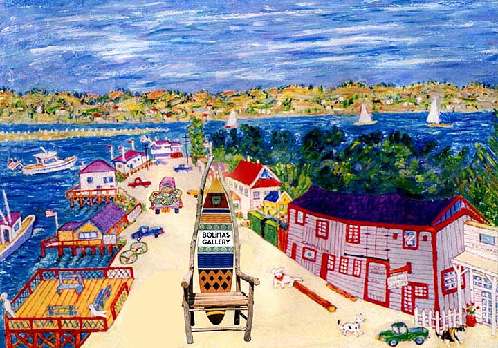 The collage on the right is based on the painting by Legendary native Bolinas artist Peter Lee Brownlee who was featured in the documentary, Painting Bolinas . Brownlee is one of the many artists who have been featured at the gallery over the years.